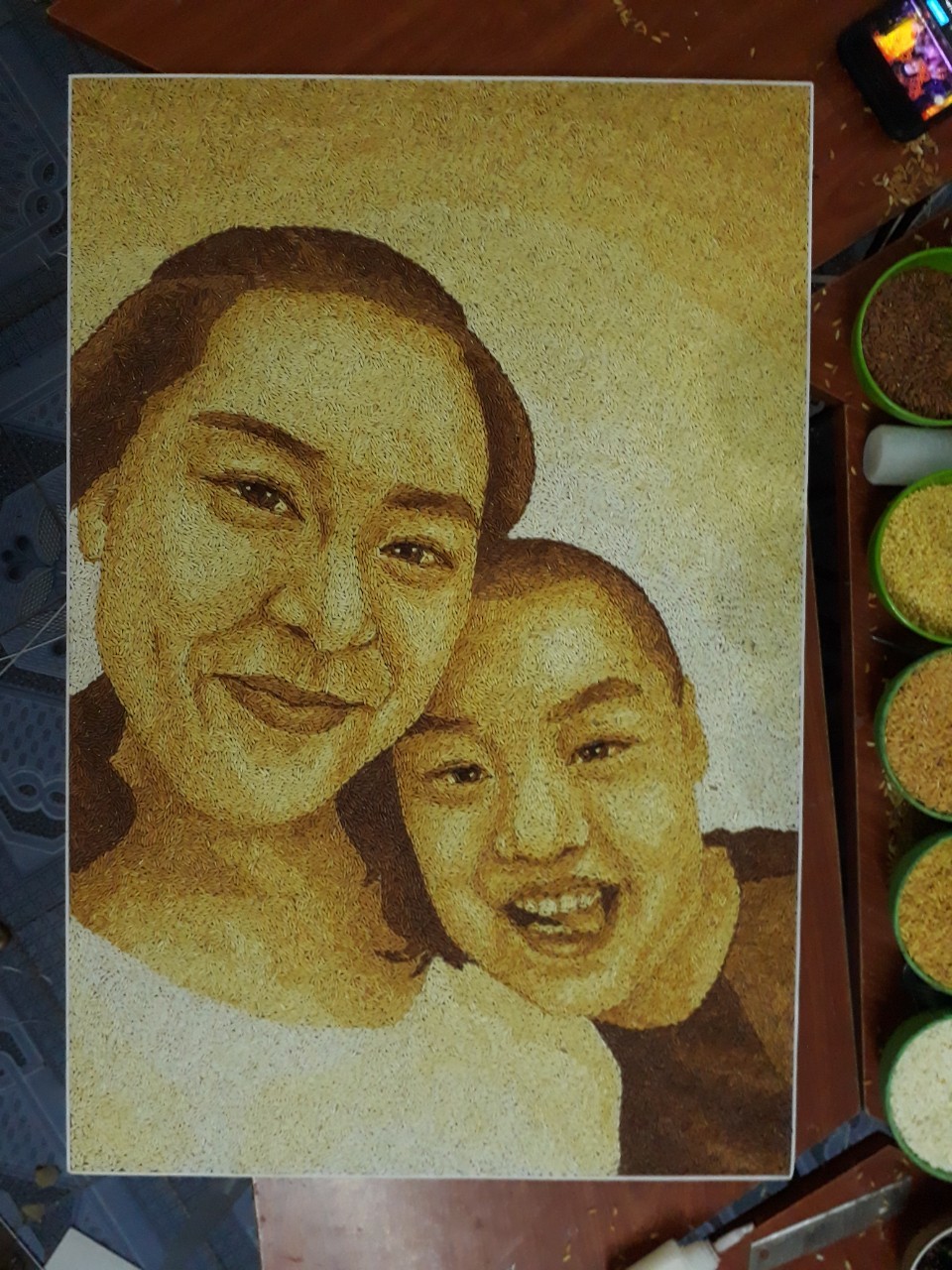 Khi đã chỉnh sửa và hoàn tất công đoạn sắp gạo, chúng tôi cố định gạo bằng một lớp keo trong suốt để gạo bám tuyệt đối vào ván.
